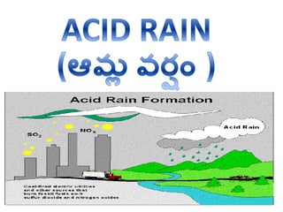 ఆంగస్ అనేశాస్త్రవేత్్1872 లో వాడాడు . దీన్న PH 5. 6 వర్కు ఉంట ంది. దీన్నకికార్ణం గాలిలోన్న CO2 నీటితో చర్య జరిపిH2CO3 ఇవవడం . వర్షం PH 5.6 ఉంట ంది. ఒకవేళ 5. 6 కంటేత్కుువ ఉంటేదాన్ని ఆమ్ల వర్షం అంటార్ు. న ైటక్ి, స్తల్యూరిక్ ఆమ్లలలు నీటిలో కరిగిఆమ్లవరషాలుగా భూమిన్న చేర్తాయి. 1. NO + O3 → NO2 + O2 2. NO2 + O3 → NO3 + O2 3. NO2 + NO3 → N2O5 4. N2O5 + H2O → 2HNO3 స్తలయర్ డ ైఆక్సైడ్ , నీర్ు , ఆకిైజనుతో కలిసి స్తల్యూరిక్ ఆమ్లం ఏర్పడుత్ ంది. SO2+½O2 →SO3 ----- H2SO4 Or SO2+½ O2 +H2O -------- H2SO4