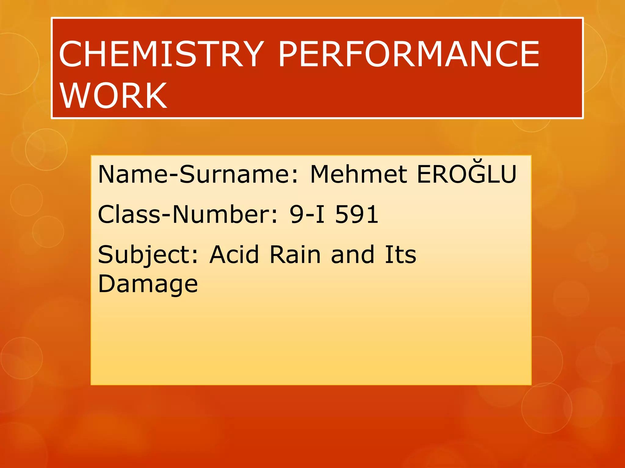 Acid rain is caused by emissions of sulfur dioxide and nitrogen oxides from human sources like power plants and vehicles. It damages forests by dissolving nutrients from soil and stripping leaves, insects and weather then further harm trees. It also harms lakes and streams by increasing acidity and aluminum levels, endangering wildlife. Buildings and objects can be damaged by acid rain peeling paint and wearing down stone. International treaties have aimed to reduce acid rain by limiting emissions.