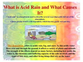 Acid rain is caused by emissions of sulfur dioxide and nitrogen oxides from fossil fuel combustion. When these gases mix with water vapor and rain, they produce acid rain that falls to Earth. Acid rain damages trees, aquatic life in lakes and streams, buildings, and can harm human health. It harms trees by causing leaves and needles to turn brown and fall off, and damages fish by raising acid levels in lakes and killing eggs and fish. Acid rain also dissolves stonework on buildings. To mitigate acid rain, power plants can install emissions scrubbers, people can reduce electricity usage, and vehicles can install catalytic converters.