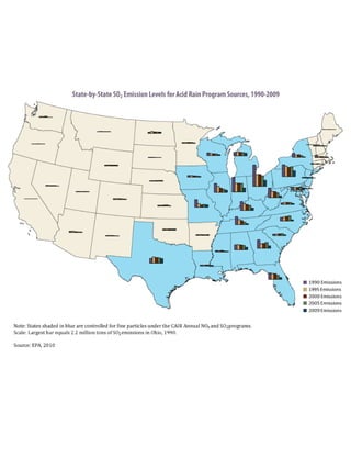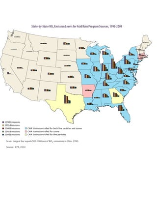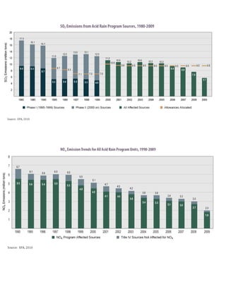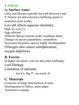 Acidic deposition, also known as acid rain, is caused by emissions of nitrogen oxides (NOx) and sulfur oxides (SOx) which primarily come from power plant emissions. When NOx and SOx react with water, oxygen, and sunlight in the atmosphere, they form acids like sulfuric and nitric acid which fall to earth as rain, snow, or dry deposition. Acidic deposition harms ecosystems by lowering the pH of soils and surface waters outside of their normal acidic range, which can damage forests and aquatic wildlife. The EPA addresses acidic deposition through its Acid Rain Program that implements emissions trading of SOx and NOx to reduce deposition and restore damaged environments.