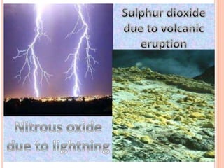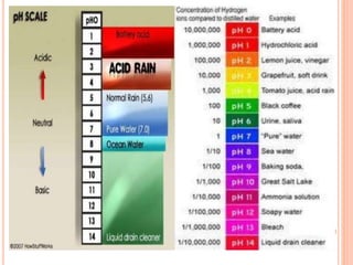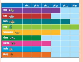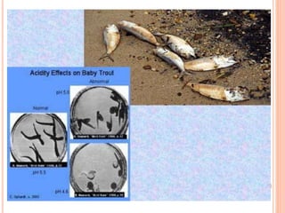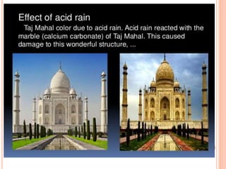 Acid rain is caused by emissions of sulfur dioxide and nitrogen oxides reacting with water in the atmosphere. It can harm plants, aquatic animals, and infrastructure by having a low pH. It impacts the environment through loss of fish in sensitive lakes and streams, eliminating insect life and fish species. Prevention methods include vehicle emission controls, fluidized bed combustion in power plants, and wet scrubbers that inject limestone to remove sulfur dioxide from smokestack gases.
