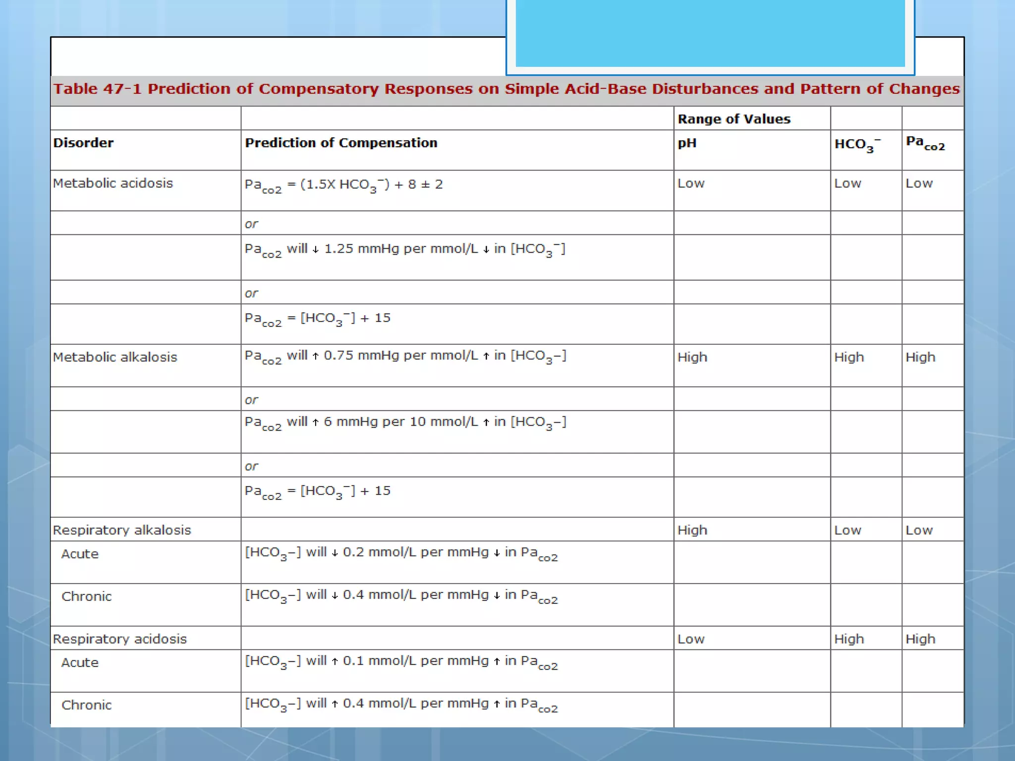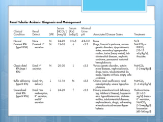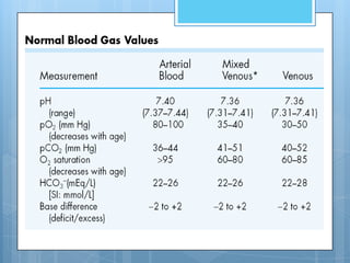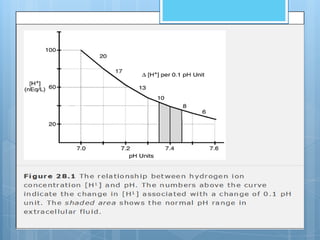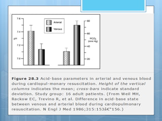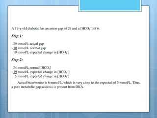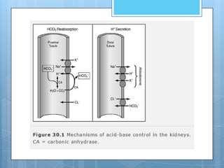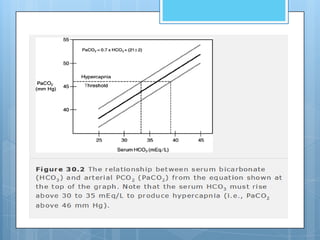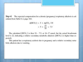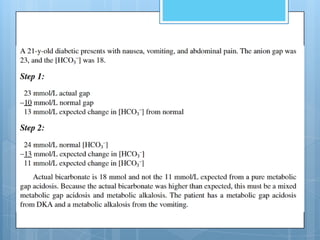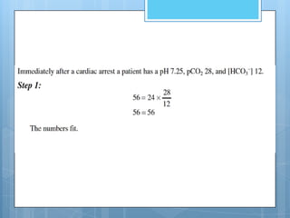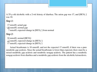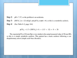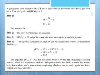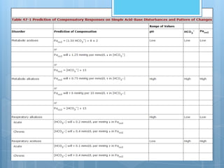 This document provides an overview of acid-base disorders. It defines different types of acid-base disorders based on pH, PCO2, and HCO3 levels. Primary acid-base disorders cause compensatory changes in PCO2 or HCO3 to maintain balance. Respiratory disorders involve changes in PCO2, while metabolic disorders involve changes in HCO3. Compensation occurs rapidly through breathing for metabolic disorders and slowly through the kidneys for respiratory disorders. Formulas are provided to assess acute vs chronic respiratory compensation and expected vs actual pH levels.