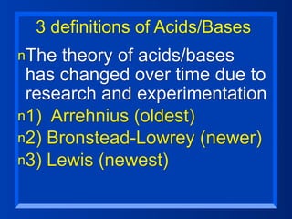 This document discusses the chemistry of acids and bases. It outlines three definitions of acids and bases: Arrhenius, Brønsted-Lowry, and Lewis. The Arrhenius definition states that acids produce hydrogen ions in water and bases produce hydroxide ions. The Brønsted-Lowry definition broadened this to include acids as hydrogen ion donors and bases as acceptors. The Lewis definition focuses on electron pair donation and acceptance. Acids react with bases to form salts and water in a neutralization reaction. Common acids include sulfuric acid, nitric acid, hydrochloric acid, and acetic acid.
