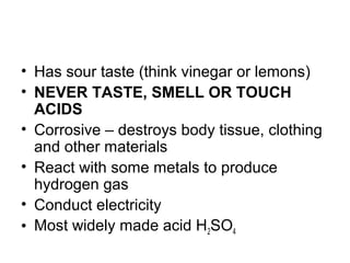 The document discusses the properties and characteristics of acids and bases. It explains that acids typically start with hydrogen and have a sour taste, while bases typically end with hydroxide and have a bitter taste. It also distinguishes between strong and weak acids/bases based on how fully they dissociate in water. Common uses of acids and bases are also outlined.