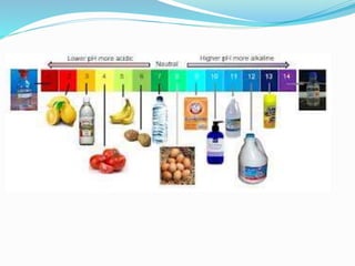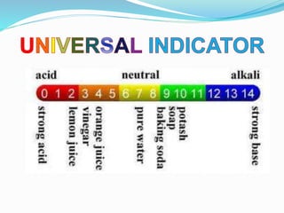 This document discusses indicators, acids, bases, and the reactions between them. It provides examples of natural and synthetic acid-base indicators and how they change color with pH. Acids are defined as sour substances that turn litmus red and donate hydrogen ions in water, while bases are defined as bitter substances that turn litmus blue and accept hydrogen ions in water. Common strong acids and bases are listed. The document also summarizes several acid-base reactions including neutralization and reactions with metals, carbonates, and oxides. It discusses the pH scale and importance of pH in everyday life. In the end, it briefly discusses the preparation and uses of several common salts.
