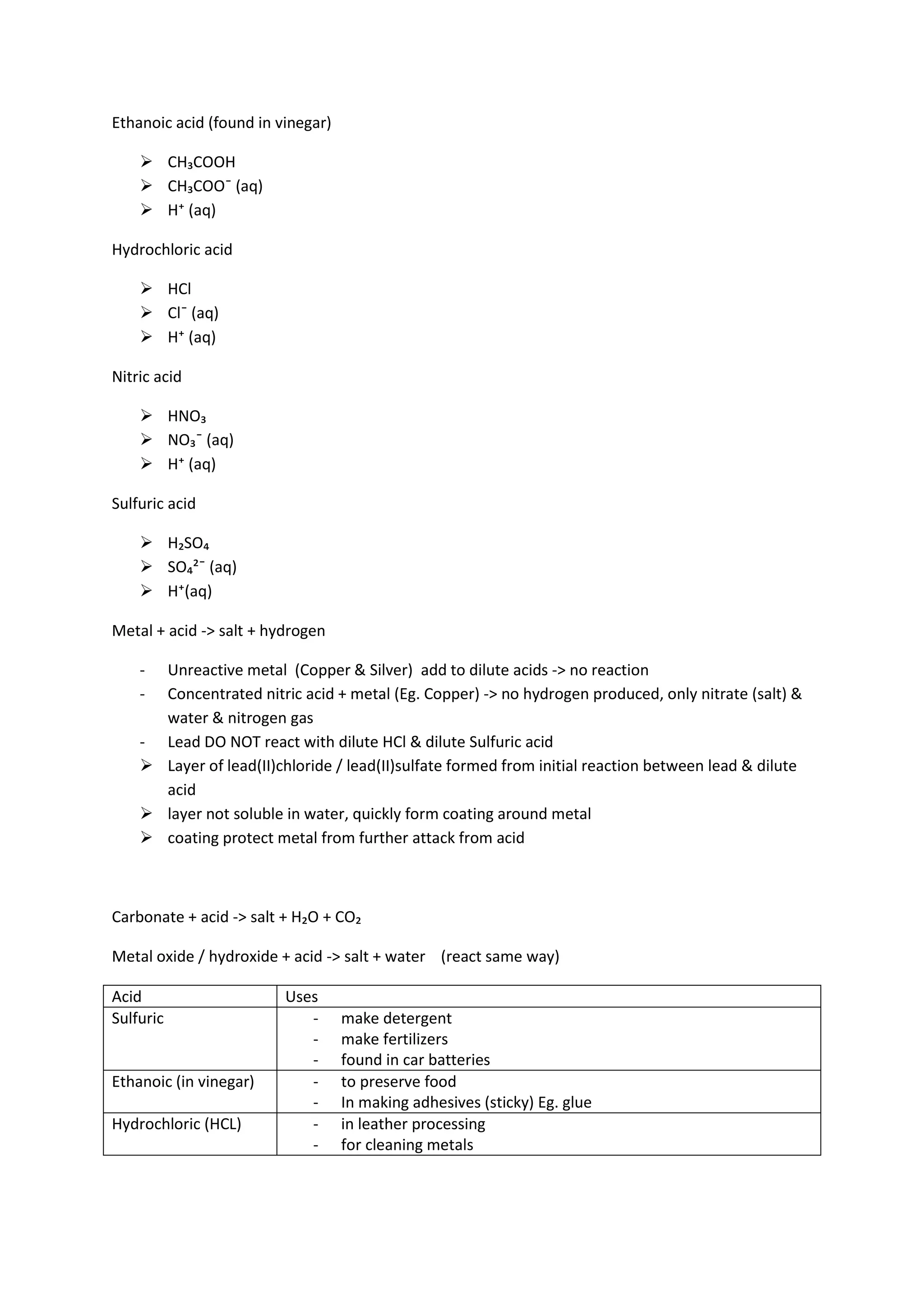 The document describes different types of acids and bases. It defines acids as substances that produce hydrogen ions (H+) in aqueous solution, and bases as substances that produce hydroxide ions (OH-). Examples of common acids include sulfuric acid, nitric acid, hydrochloric acid and ethanoic acid. Examples of bases are metal oxides and metal hydroxides. The document also discusses the reactions of acids and bases, including metal-acid reactions, and the uses of some common acids and bases.