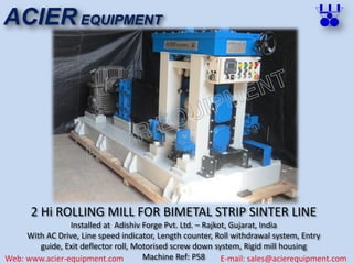The document details various equipment and machinery supplied by Acier Equipment for the steel and sheet processing industries, including cut to length lines, rolling mills, and special purpose attachments. It highlights specific products with technical specifications and installation locations, alongside contact information and links to the company’s online resources. Acier Equipment is noted for its reliability and cost-effective solutions in the manufacturing of steel products.
