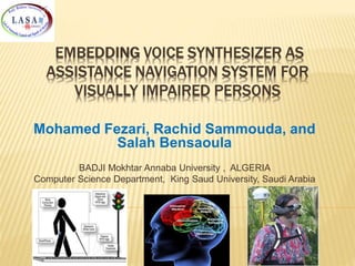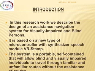 This document discusses the design of a portable assistance navigation system for visually impaired individuals, incorporating a microcontroller and speech synthesizer to facilitate travel. The system features ultrasonic sensors for obstacle detection and is designed to be user-friendly and cost-effective. Ongoing research is focusing on enhancing the system's capabilities, including integrating GPS for improved navigation.
