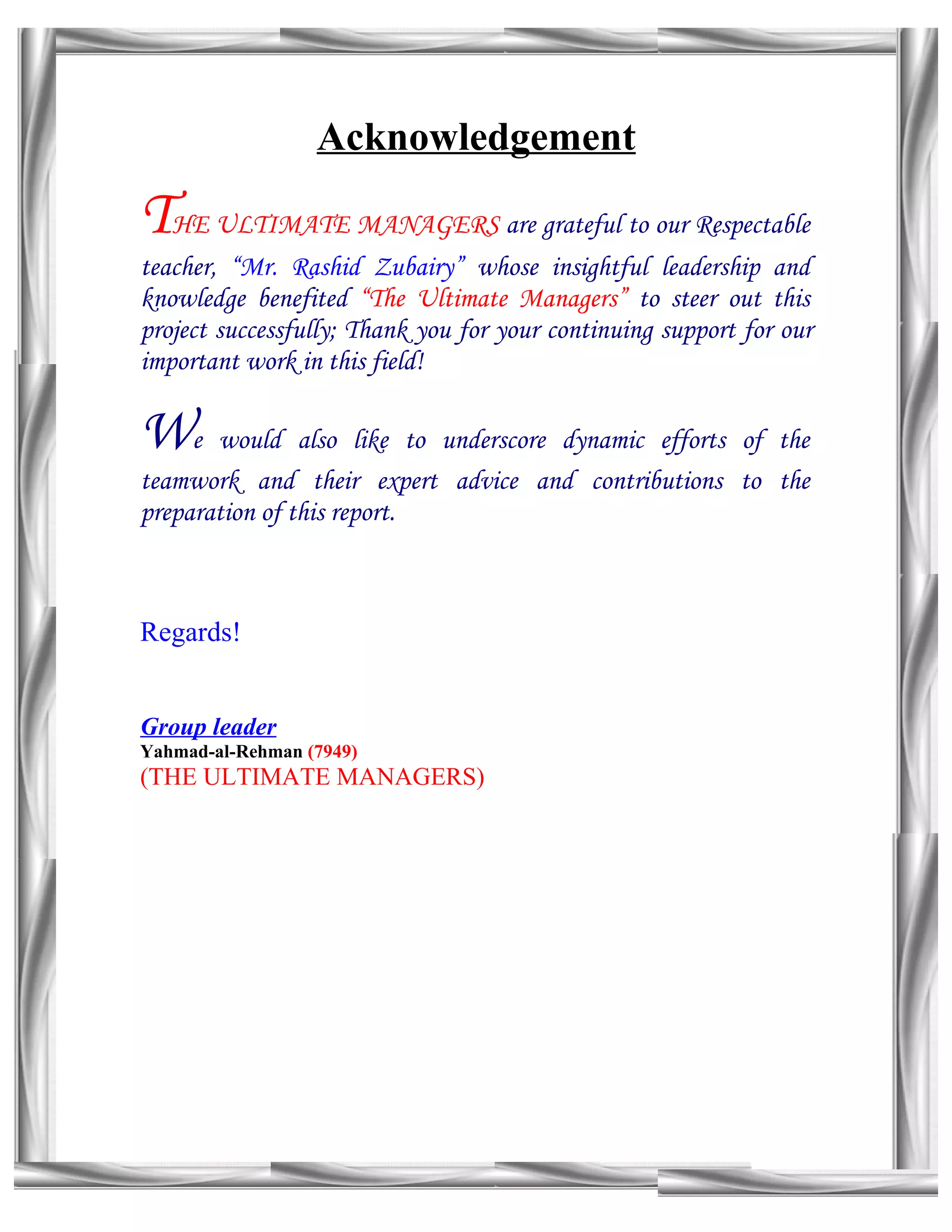 This acknowledgement thanks their teacher Mr. Rashid Zubairy for his guidance that helped the student group called The Ultimate Managers successfully complete their project. It also thanks the team for their efforts and contributions to preparing the report. The acknowledgement is signed by the group leader Yahmad-al-Rehman of The Ultimate Managers.