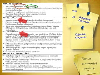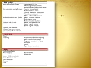 This document discusses ACL reconstruction failure and revision surgery. It notes that instability, stiffness, and pain could indicate failure. The main causes of failure discussed are traumatic failure, biologic failure, and technical error, particularly malpositioned tunnels. It provides statistics on ACL reconstruction and failure rates. It highlights potential pitfalls in revision surgery like malpositioned tunnels, widened tunnels, soft tissue grafts, and fixation devices. The conclusion emphasizes that ACL revision is demanding, requires careful preoperative planning, and has lower success rates than primary ACL reconstruction. Experience is important for managing revision cases.