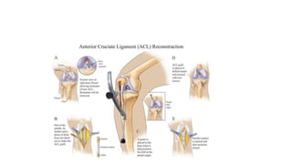 - Treatment includes initial RICE and bracing followed by physical therapy. Surgery with autograft reconstruction using the patellar tendon or hamstrings is recommended for active individuals to restore stability. Post-op rehabilitation progresses through phases of range of motion and strength training over 6-12 months