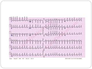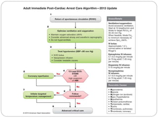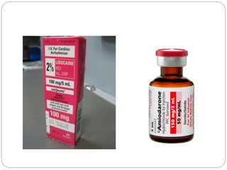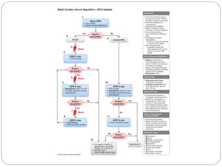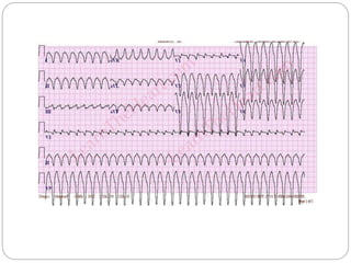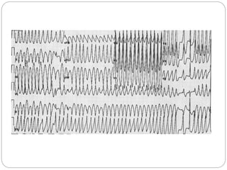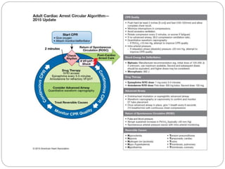 This document provides guidelines and algorithms for paramedics on Advanced Cardiac Life Support (ACLS). It outlines the main algorithms for cardiopulmonary resuscitation (CPR), pulseless arrest, tachycardia with a pulse, bradycardia, and return of spontaneous circulation (ROSC). For each condition, it lists the steps for assessment, treatment, and medications. Key treatments include defibrillation, cardioversion, intubation, intravenous access, pacing, epinephrine, amiodarone, atropine, and addressing reversible causes. The goal is to follow standardized procedures to properly diagnose and treat life-threatening cardiac arrhythmias or arrest.