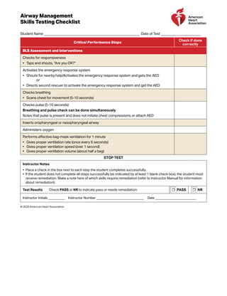 This document contains checklists for testing students on their skills in Advanced Cardiovascular Life Support. It includes checklists for assessing skills in adult high-quality BLS, airway management, and various megacode scenarios involving bradycardia, tachycardia, ventricular fibrillation, pulseless electrical activity, and post-cardiac arrest care. The checklists are used to check that students correctly complete critical steps for each skill or scenario.