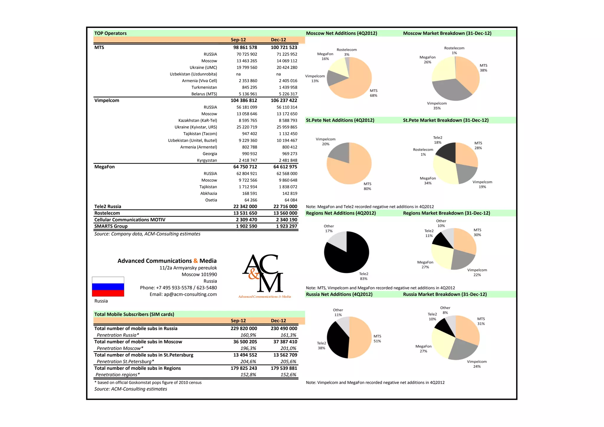 The document provides market share data for major mobile operators in Russia as of the fourth quarter of 2012. It shows that while the total number of mobile subscribers in Russia grew slightly from 229.8 million to 230.5 million in Q4 2012, the three largest operators - MTS, VimpelCom, and MegaFon - all experienced negative net additions during this period. MTS maintained the largest share with over 100 million subscribers, followed by VimpelCom with over 106 million subscribers, while MegaFon had around 64.6 million subscribers.