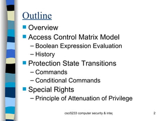The document discusses an access control matrix (ACM) model for representing access privileges. The ACM captures relationships between subjects (users, processes) and objects (files, variables). It consists of a matrix where each entry specifies rights a subject has to an object. The document outlines how to represent state transitions that change the ACM using primitive operations like creating/destroying subjects/objects and adding/deleting rights. Conditional commands allow transitions if certain conditions are met.
