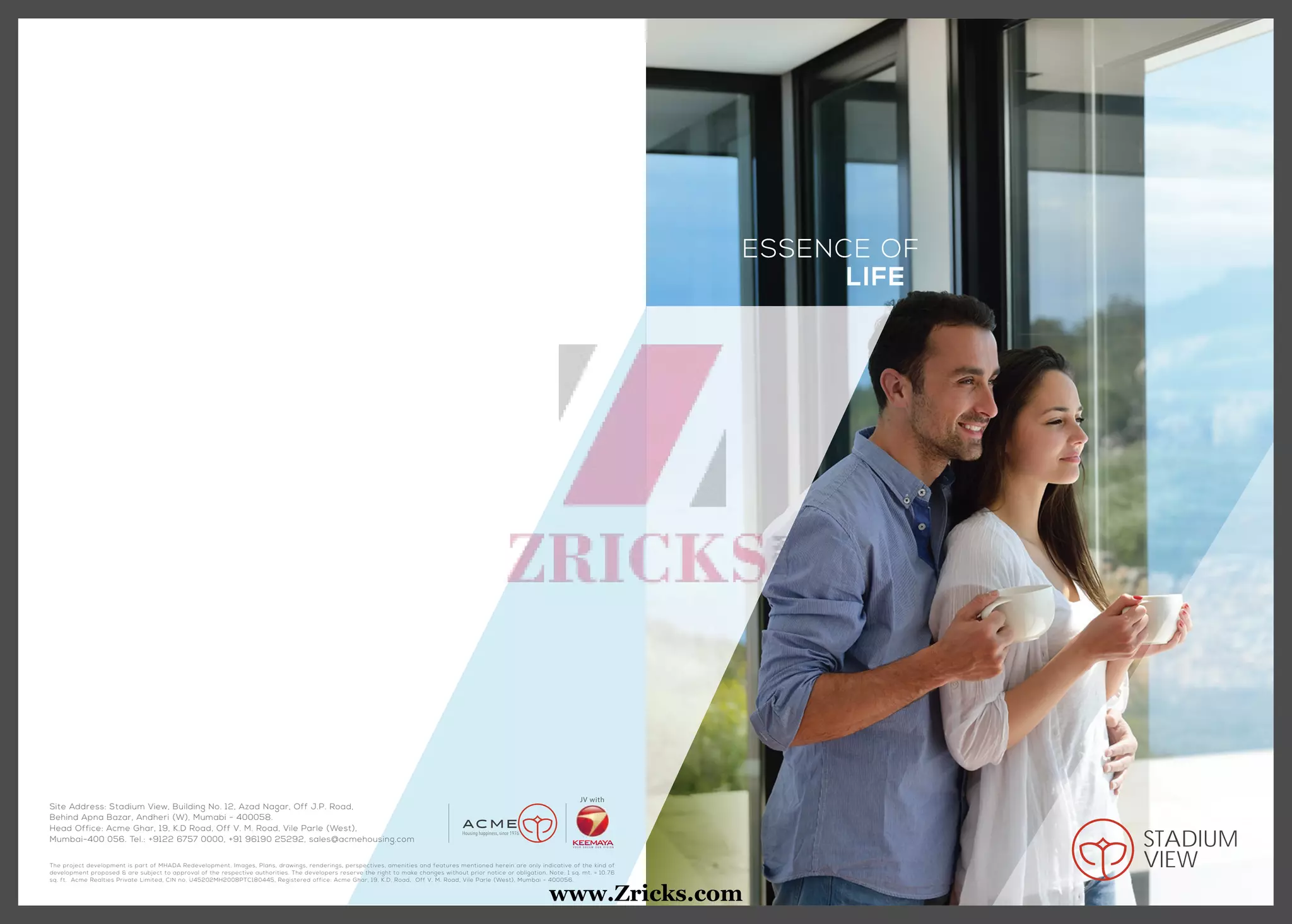 This document provides information about a new residential project called Stadium View located in Andheri West, Mumbai. It is an 18-storey tower being developed by Acme Realties Private Limited. The project offers various amenities and features like a grand lobby, fitness center, parking, and emphasis on safety. Floor plans show sample 2 BHK units of 635 square feet. Connectivity details and proximity to various landmarks in the area are provided.