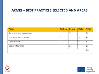 The document outlines best practices for European integration, highlighting various initiatives in Italy, Turkey, and Spain that support the integration of immigrants through education and social services. Projects include language cafés, support for refugees, employment programs for Roma communities, and training for immigrant healthcare professionals. Each initiative details its target audience, budget, duration, staff requirements, and materials needed.