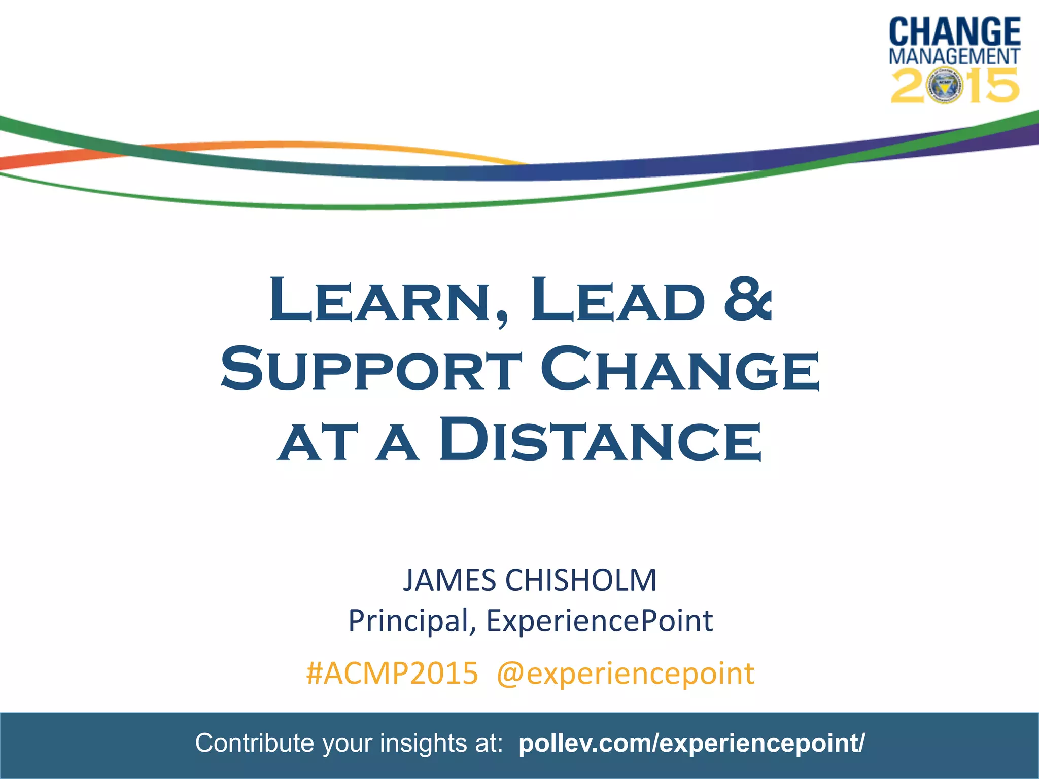 The document discusses learning, leading, and supporting change at a distance. It describes a story of training 40 people across 8 teams and 3 sites over 2 days, with most of the training being team-based learning by doing activities. It also shares insights into retention rates from different learning methods and implies that online training can teach models and tools but not mindsets and reflexes. The document prompts discussion on tips for learning change at a distance. Responses emphasize using interactive communication techniques, regional engagement groups, coaching, real-life examples, and virtual communities of practice.