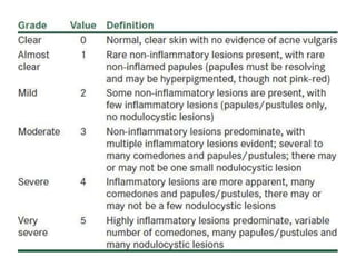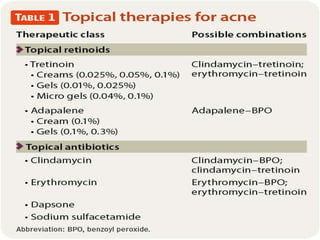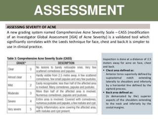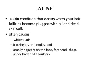 Acne is a common skin condition caused by clogged hair follicles and bacterial infection. It presents as whiteheads, blackheads, pimples, and deeper lumps. Risk factors include genetics and hormones. Types include infantile acne, drug-induced acne, and acne fulminans. Treatment involves topical retinoids and antibiotics for mild to moderate acne, with oral antibiotics and isotretinoin for more severe cases.