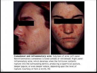 Acne vulgaris is a disorder of the pilosebaceous unit caused by increased sebum production, follicular hyperkeratinization, and bacterial colonization. It manifests as comedones, papules, pustules, nodules, and cysts. Treatment involves addressing underlying causes with topical retinoids, antibiotics, and oral antibiotics which reduce inflammation and P. acnes levels. For severe nodular cystic acne, oral isotretinoin is used which decreases sebum production and has anti-inflammatory effects.