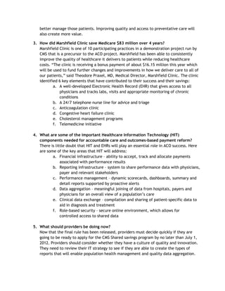 The document discusses Accountable Care Organizations (ACOs) which were created by the Affordable Care Act to improve quality and lower costs. It provides frequently asked questions about ACOs, including whether they are viable, how providers can save money through ACOs, examples of successful ACO programs like Marshfield Clinic, and the healthcare IT components needed to support ACOs. Providers are encouraged to invest in quality, innovation, and data/analytics to prepare for value-based payment models like ACOs.