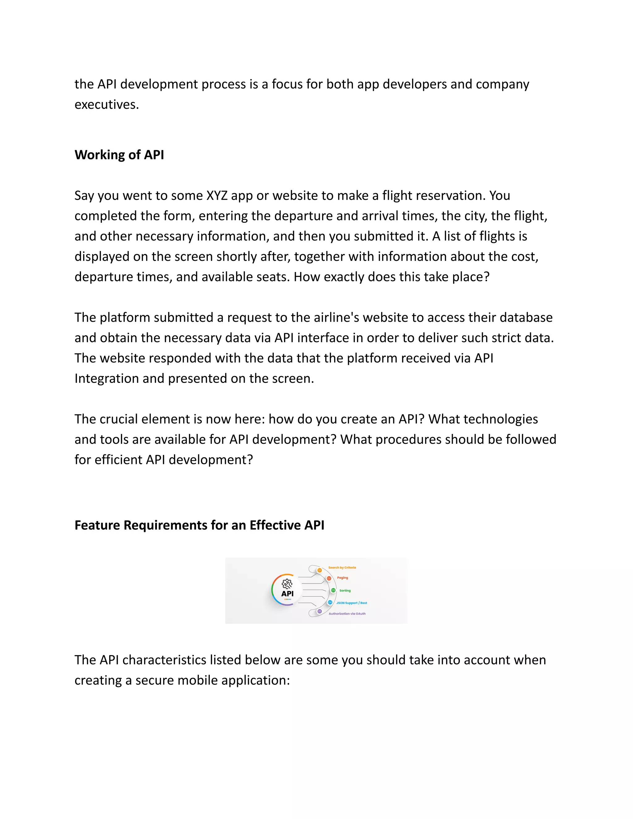 The document serves as a comprehensive guide to API development, highlighting the significance of APIs in modern web applications and their crucial role in facilitating communication between software platforms. It discusses essential features and best practices for creating effective APIs, including authorization, data management, and security considerations. Additionally, the document explains the differences between REST and SOAP APIs and ends with an invitation for professional API development services.