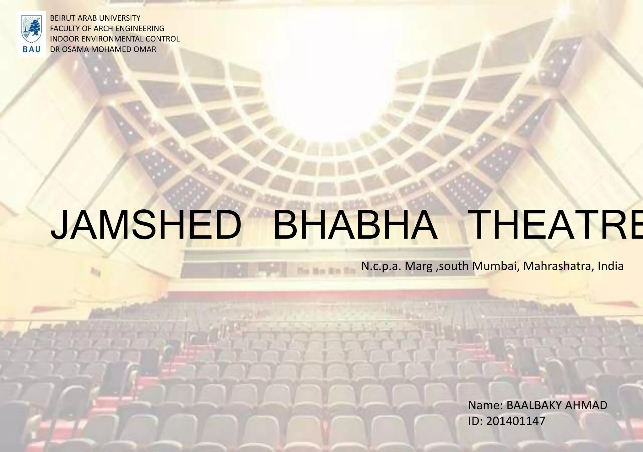 The Jamshed Bhabha Theatre is located within the NCPA complex in Mumbai, India. It was built in 1959 and has a capacity of 1,109 people. The theatre occupies an area of about 3,200 square meters on land reclaimed from the sea. It is surrounded by hotels, malls, and offices and located near important landmarks. The theatre has detailed plans showing the auditorium layout, seating arrangement, and backstage areas. It also has green rooms, a control room to operate lighting and sound, and technical features in the walls, floors, and catwalks to enhance acoustics.