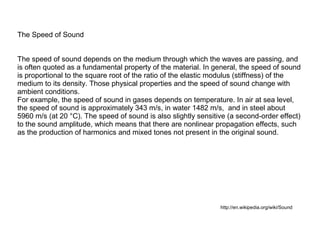 Sound waves are mechanical waves that propagate through a medium as variations in pressure. Acoustic sensors convert these pressure variations into electrical signals using various transduction mechanisms like piezoelectricity, capacitance changes, or fiber optic interferometry. Common acoustic sensors include microphones, hydrophones, and surface acoustic wave sensors which propagate mechanical waves along the surface of piezoelectric materials to enable highly sensitive measurement.