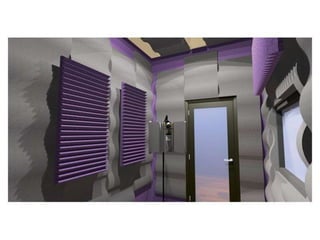 This document discusses various types of acoustical materials used to control sound. It describes sound absorbers like acoustical foam panels, fabric wrapped panels, and ceiling tiles that are used to eliminate sound reflections and reduce reverberation. These products are used in recording studios, broadcast facilities, and other commercial and industrial spaces. The document also provides details on the construction and specifications of one such acoustical wall panel.