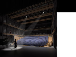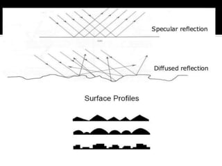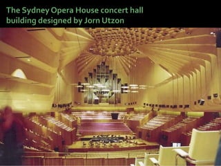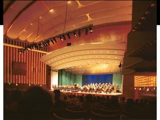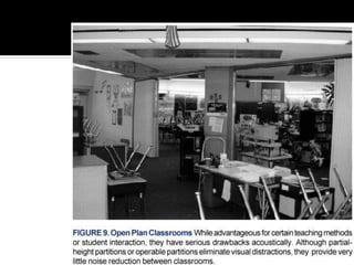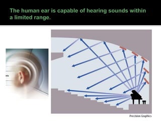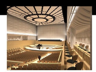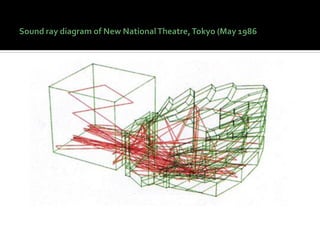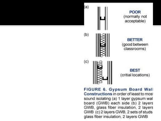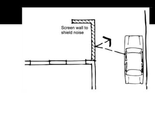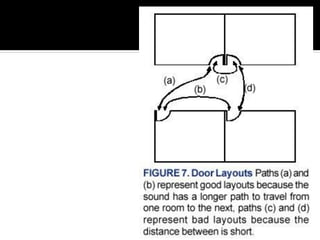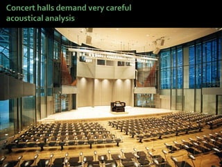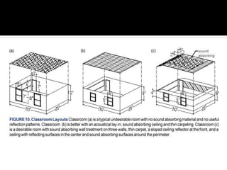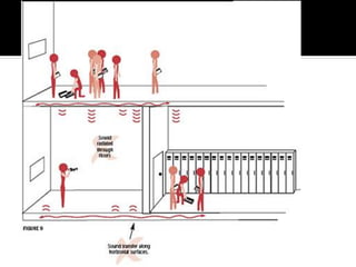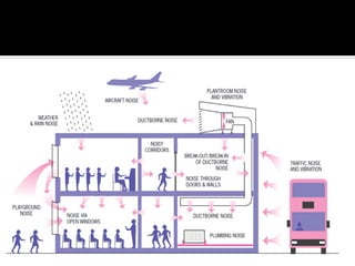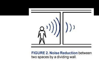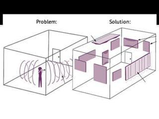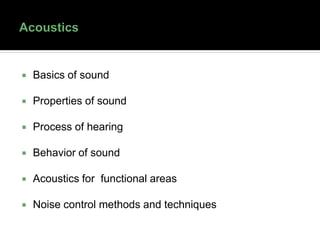 This document discusses acoustics and noise control. It begins by defining acoustics and describing the basics of sound, including properties like amplitude, frequency, wavelength. It then explains sound propagation principles such as reflection, refraction, diffraction and absorption. Different materials and their effects on sound are described. Noise control techniques like site planning, architectural design and sound barriers are discussed. Specific examples of architectural designs that enhance sound are provided.