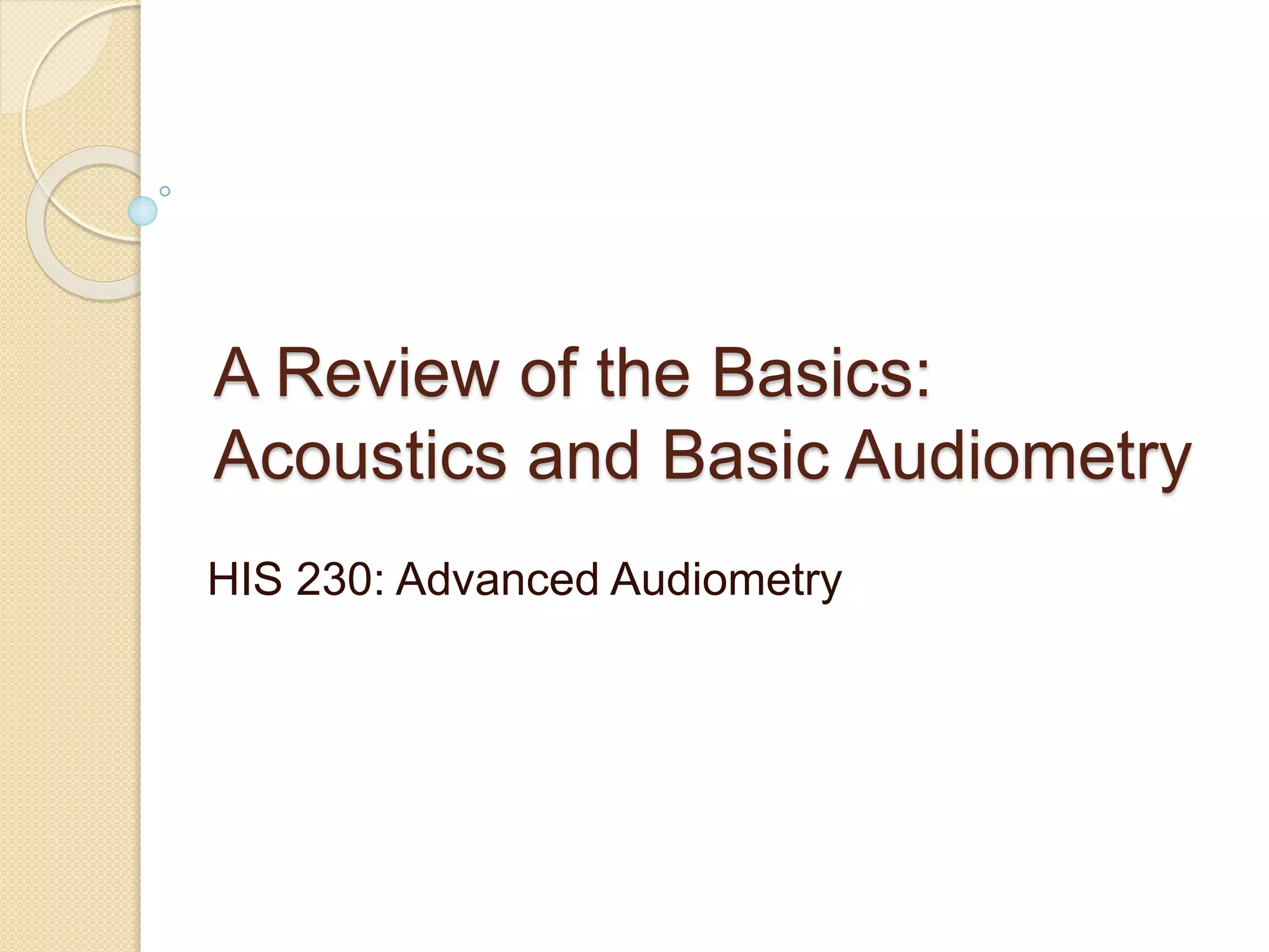 This document provides an overview of acoustics and basic audiometry concepts. It defines key terms like frequency, intensity, pitch and loudness. It explains that frequency is a physical property of sound measured in Hertz, while pitch is the human perception of how high or low a sound is. Intensity is the physical measurement of sound pressure in decibels, while loudness is the human perception of sound intensity. The document also reviews concepts like pure tones, complex sounds, fundamental frequency, harmonics, and resonant frequency. It describes how to perform a basic audiologic assessment, including taking a case history, performing puretone audiometry to test air and bone conduction thresholds, and assessing speech recognition.