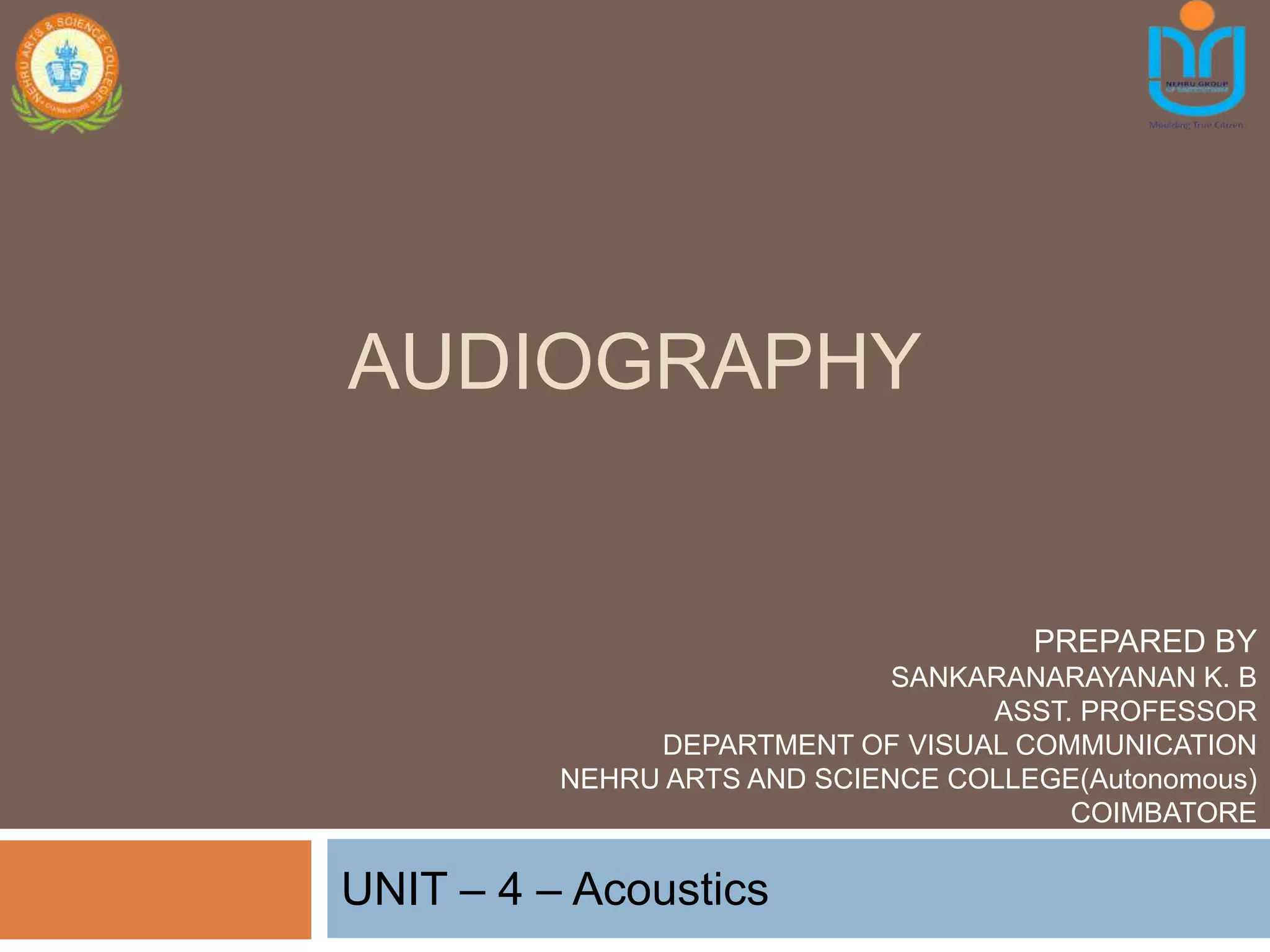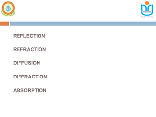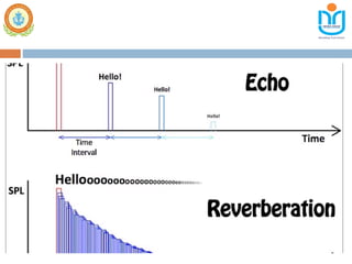 The document discusses key concepts in acoustics including sound reflection, absorption, diffraction, standing waves, reverberation time, room modes, and the inverse square law. It explains how reverberation time can be calculated using the Sabine equation and lists common absorption coefficients for various materials. Finally, it defines binaural hearing and the differences between mono and stereo audio formats.