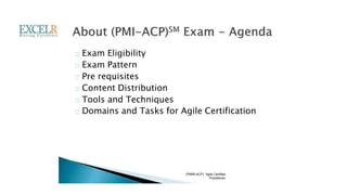 The document outlines the eligibility requirements and examination patterns for the PMI® Agile Certified Practitioner (PMI-ACP) certification, emphasizing the importance of Agile methodologies in software development. It highlights that Agile practices facilitate an adaptive and iterative approach to project management that contrasts with traditional methods. The Agile Manifesto, established in 2001, underpins this framework, promoting collaboration and flexibility throughout the development cycle.