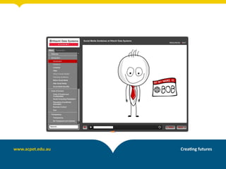 This document provides information about an eLearning induction program for RTO staff. It discusses blended learning models including face-to-face, self-paced, and online facilitated learning. Examples are given for different assessment methods that can be used for each model. The document also discusses trends in eAssessment, including using mobile devices to capture evidence through video, audio, images and QR codes. Staff are encouraged to think about how they can apply blended learning approaches to their own courses and which model may work best for their RTO.