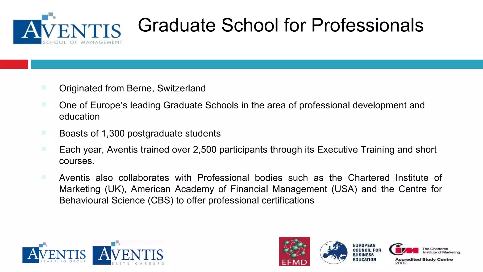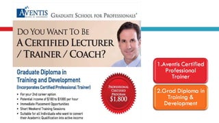 The document provides information about Aventis School of Management, including that it is one of five business schools in Singapore affiliated with the European Foundation for Management Development (EFMD). It also describes the Aventis Certified Professional Trainer program, which is an 18-hour skills training program that certifies participants to become professional trainers.