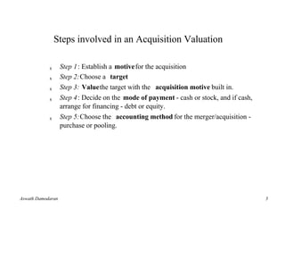2) The document outlines the key steps in an acquisition valuation process: establishing the motive, choosing a target, valuing the target with the motive incorporated, and deciding on payment terms.