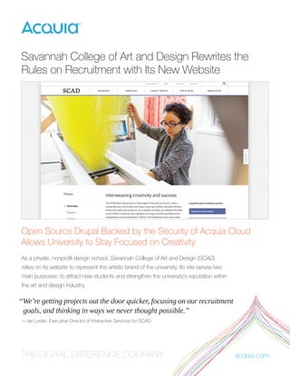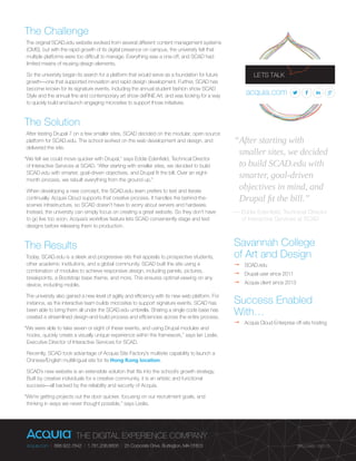 Savannah College of Art and Design (SCAD) rebuilt its website on the Drupal platform to better manage content and attract new students. SCAD tested Drupal on smaller sites before using it to rebuild SCAD.edu over eight months. Using Drupal and Acquia Cloud allowed SCAD to focus on creativity while Acquia handled infrastructure. The new responsive site appeals to prospective students and showcases SCAD's events. SCAD can now quickly build microsites and launched a multilingual site, positioning itself for continued growth.