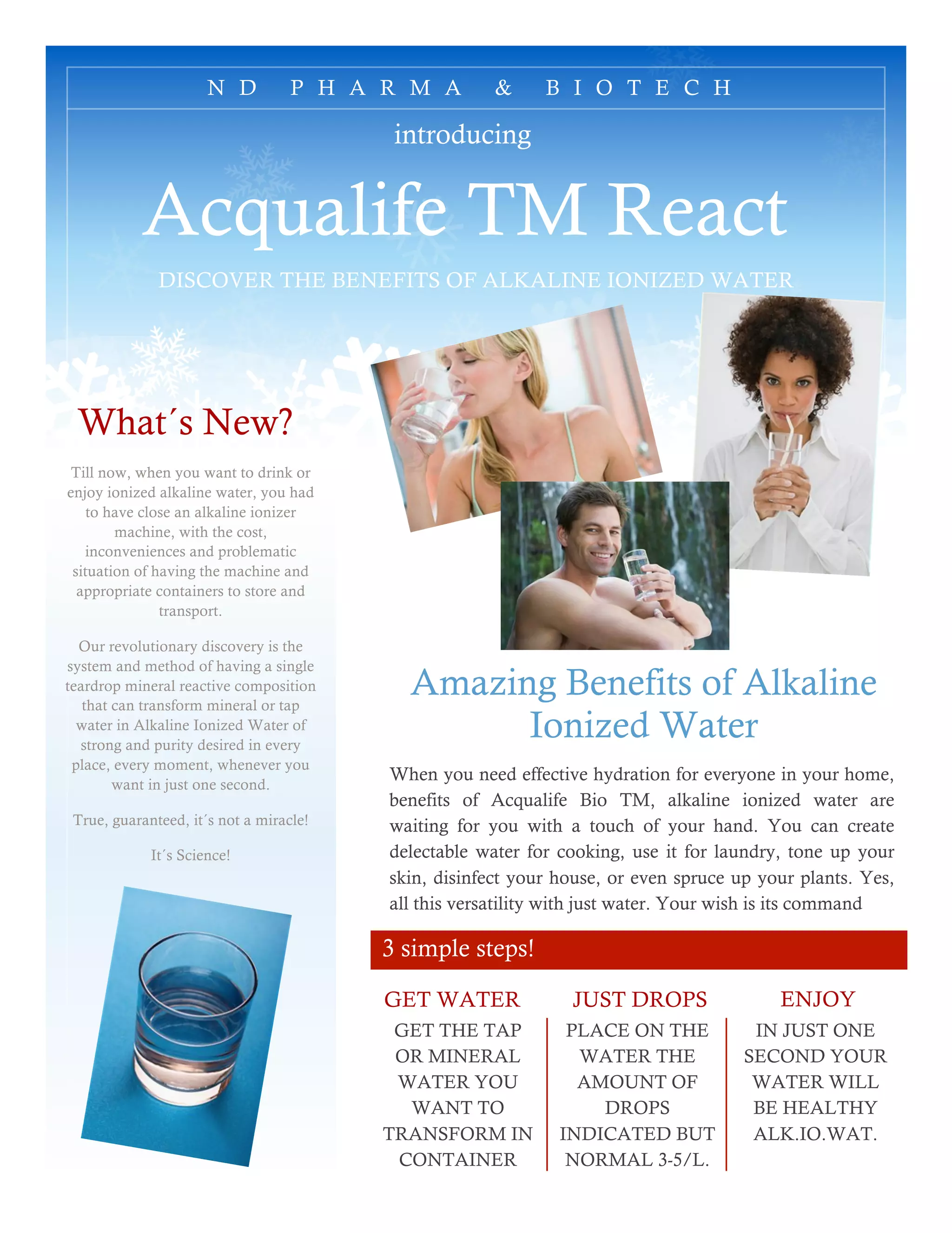 Acqualife React is a revolutionary product that allows users to transform tap or mineral water into alkaline ionized water using a single teardrop mineral reactive composition. The drops are added to water, and in just one second the water's pH is raised and it takes on the benefits of alkaline ionized water. These benefits include increased hydration, energy, detoxification, and support of overall wellness. The document provides examples of how alkaline ionized water created with Acqualife React can be used for cooking, cleaning, farming/gardening, and more.