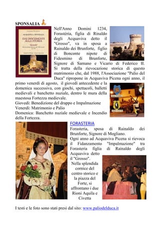 Nel 1234, Forastéria, figlia di Rinaldo degli Acquaviva, sposa Rainaldo dei Brunforte in un matrimonio storico rievocato annualmente ad Acquaviva Picena. L'evento, organizzato dall'associazione 'Palio del Duca', si svolge il primo venerdì di agosto e include giochi, spettacoli e un banchetto nuziale all'interno di una fortezza medievale. Le celebrazioni comprendono benedizioni, il matrimonio stesso e un incendio simbolico della fortezza.