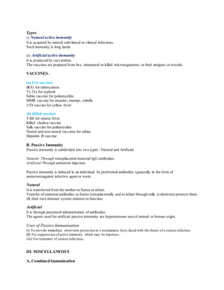 Acquired immunity is the resistance acquired by an individual during life and can be active or passive. Active immunity develops after natural infection or vaccination and stimulates both antibody-mediated and cell-mediated immunity, resulting in long-lasting protection. Passive immunity is induced by transferring preformed antibodies through maternal transfer to fetus/infant or injection of antiserum, providing immediate but short-term protection until the recipient can develop their own active immunity. Vaccines provide artificial active immunity and are prepared from live attenuated or killed microorganisms or their antigens.