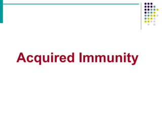 The document discusses the immune system and different types of immunity. It describes innate immunity, which provides non-specific protection, and adaptive immunity, which provides antigen-specific protection through B cells and T cells. It then focuses on the differences between active and passive immunity. Active immunity develops through exposure to an antigen and results in immunological memory, while passive immunity involves the transfer of ready-made antibodies without memory. Active immunity can be acquired naturally through infection or artificially through vaccination.