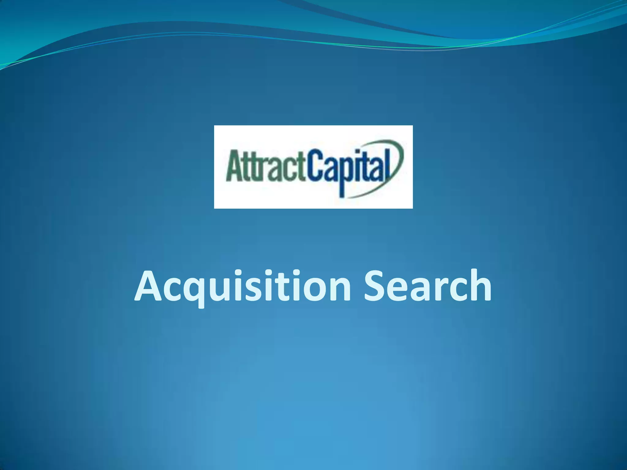 Acquisition search is a strategic tool that can lead to a large stream of acquisitions and new pathways for building value. It is a transformative process that produces a significant payoff and can redefine a company's strategy or business model. An end-to-end acquisition search service can help narrow targets, generate prospects, establish credibility, develop valuations, structure deals, manage due diligence, and close transactions. This process relies on proven acquisition financing and over 25 years of M&A experience closing over 150 deals worth $1.2 billion.