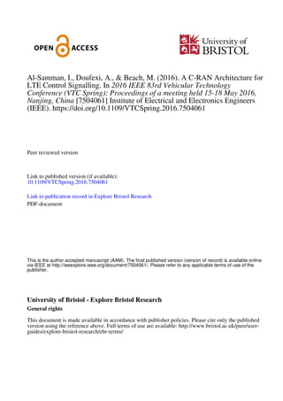 This document proposes a new C-RAN architecture for LTE control signaling called C-RAN.D-MME. It integrates the MME functionality within the BBU located in data centers, treating each C-RAN like a single cell. This simplifies procedures like paging and tracking area updates. Analysis shows the new architecture reduces signaling load for initial attachment, UE-generated services, network-triggered services, handovers, and tracking area updates compared to previous D-RAN architectures. Evaluation results demonstrate significant improvements in reducing signaling load for key network metrics.