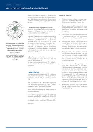 Documentul detaliază procesul de acreditare pentru utilizarea instrumentelor de dezvoltare individuală Human Synergistics, care se derulează în patru etape: discovery, instruire metodologică, implementare, și certificare. Participanții vor învăța să folosească diverse instrumente pentru a susține dezvoltarea personală și profesională, inclusiv evaluări privind stilurile de leadership și eficacitatea managerială. Certificarea permite utilizarea acestor instrumente în consultanță și training, îmbunătățind performanța și colaborarea în organizații.