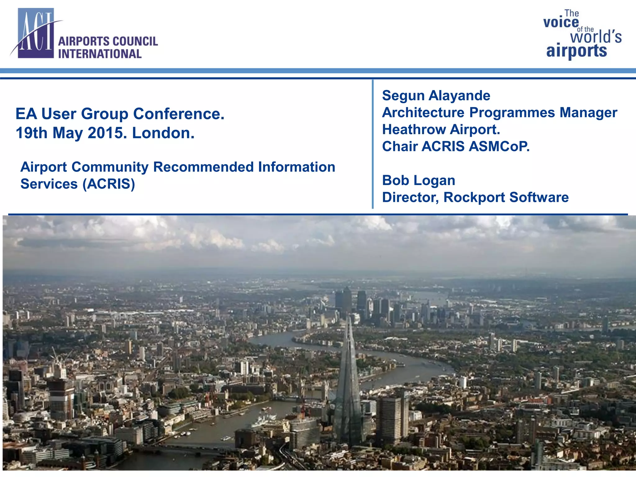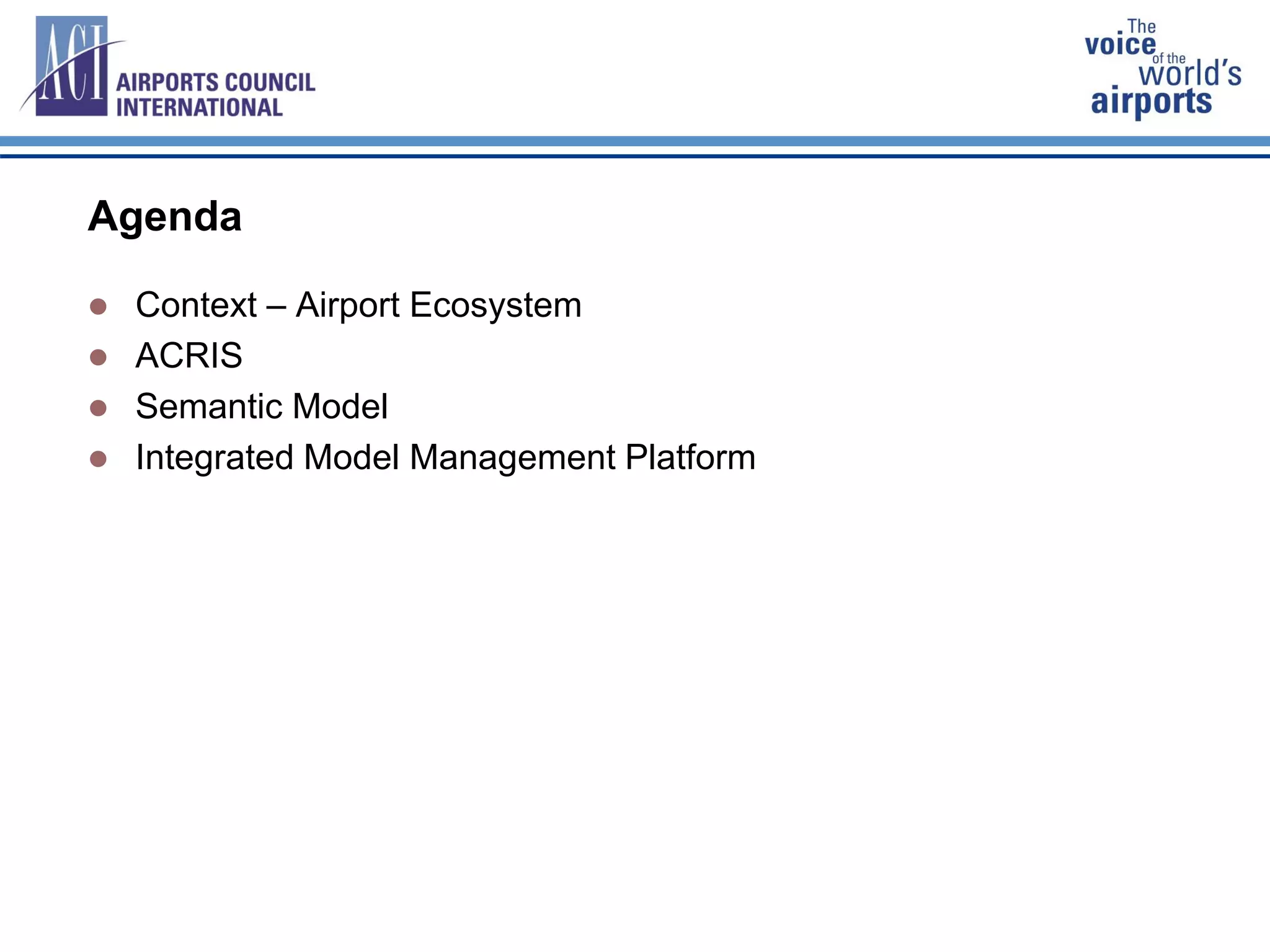 The document discusses the Airport Community Recommended Information Services (ACRIS) which was established by Airports Council International (ACI) to establish airport information sharing standards. ACRIS has developed a semantic model and integrated model management platform to address issues with fragmented standards and data quality problems in airport information sharing. The semantic model is based on industry models and global standards, and the model management platform provides tools for collaborative modeling and change management of the semantic model.