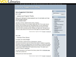 This document discusses the challenges of implementing Web 2.0 technologies in libraries to meet changing user needs. It emphasizes developing a learning culture, integrating 2.0 tools into strategic planning, using technology to improve services and communication, and giving staff time and support for creative projects. Barriers to success include not aligning social media with the library's mission or planning for maintenance. The key is assessing impact and devoting resources to building an environment where staff have flexibility to innovate.