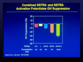 1) Acromegaly is caused by excess growth hormone production, usually from a pituitary tumor. The goals of treatment are to control symptoms, suppress hormone levels, decrease tumor size, and preserve normal pituitary function.