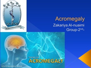 Acromegaly is a rare disorder caused by excess growth hormone due to a benign tumor in the pituitary gland, leading to enlargement of extremities and facial features. Symptoms include changes in appearance, joint pain, diabetes, and other serious health risks. Treatment options focus on tumor removal and hormone regulation, but changes in bony tissue growth are irreversible.
