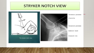 • Examination shouldbe in sitting or standing w/o support for the injured arm