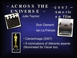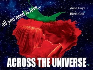 The document provides a summary of the 2007 film "Across the Universe". It describes the film as a love story set in the 1960s, depicting the turbulent period of anti-war protests and the rise of the counterculture movement. The film follows an upper-class American girl named Lucy who falls in love with a poor Liverpudlian artist named Jude, and their relationship as they and their friends get swept up in the changing times. It is noted that the film features 33 Beatles songs and is narrated through their music.